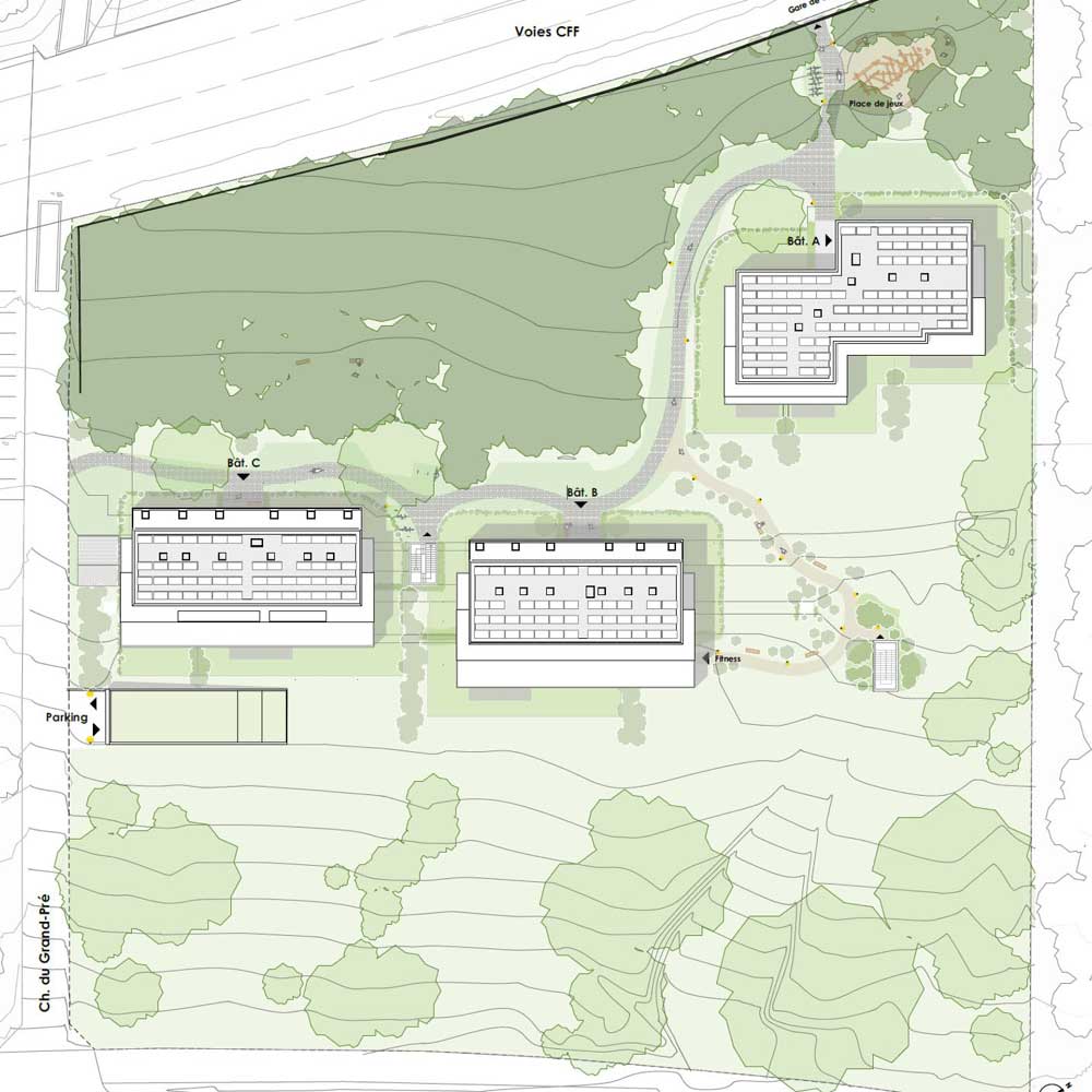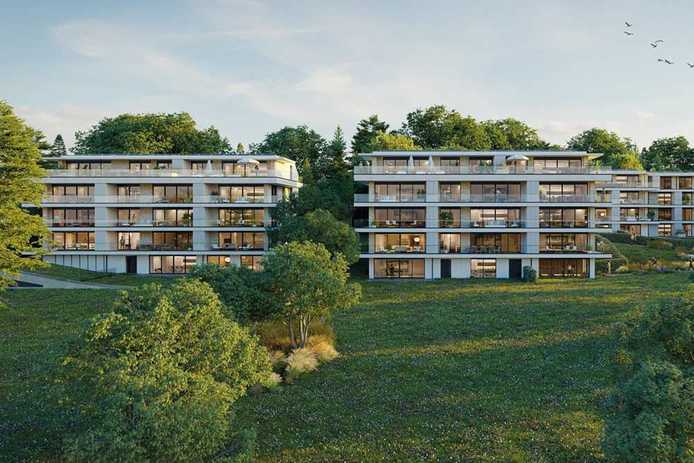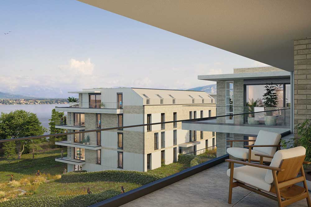Les trois bâtiments du «Parc de Staël» s’insèrent remarquablement bien dans le paysage. Les matériaux de construction en argile assurent une fonction essentielle: la construction est réalisée avec une maçonnerie monolithique qui garantit l’isolation thermique, tandis que les façades en clinker se distinguent par leur élégance et leur longévité. (Illustration: CCHE Nyon SA; photo: Gasser Ceramic)